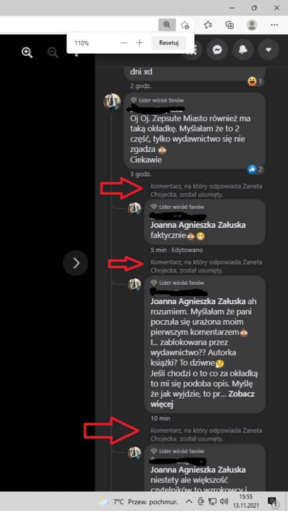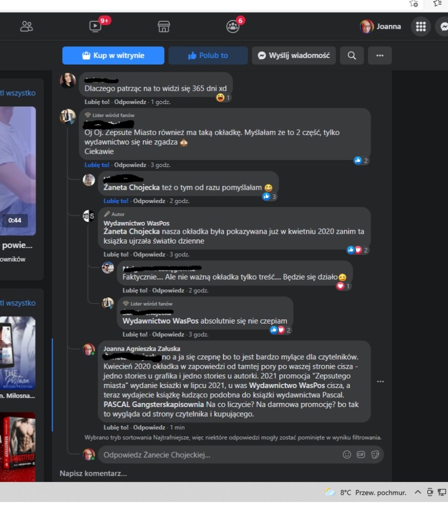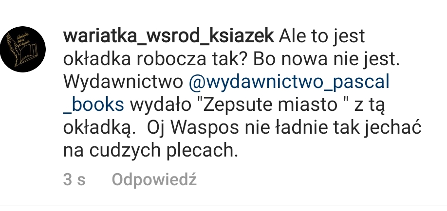 Tłumaczenie wydawcy że liczba zdjęć do użytku komercyjnego jest ograniczona w bazie są zrozumiałe, ale…po to ma się grafika, aby okładka nie była kalką innej. Jest co najmniej kilka okładek ukazanych w ostatnich kilku miesiącach gdzie pewne motywy, zdjęcia się powtarzają, ale nigdzie nie widać kalki czy kopii tak, jak w tym przypadku. Jest też wiele autorek i wydawców, którzy dbają, aby nowe książki nie kojarzyły się w sposób bezpośredni z innymi wydawnictwami czy publikacjami. Więc wszyscy wiemy, że można. Ponadto jest coś takiego jak ogólne rozeznanie rynku i kreatywność, w osobistym odczuciu tutaj w wydawnictwie Waspos tego zabrakło. Osobiście uważam, że zabrakło również przyzwoitej reakcji na liczne głosy wskazujące wybór okładki jako dubel, kasowanie komentarzy, blokowanie czytelników lub tak jak w moim przypadku recenzentów jest bardzo słabe. W moim subiektywnym odczuciu wydawca ma czas, aby zmienić okładkę no, ale chyba liczy, że ludzie czekający na kontynuację „Zepsutego Miasta” złapią się na przynętę. I to tyle co mam do powiedzenia w tej sprawie tak od siebie. Bardzo przepraszam A.M. Flauberta za to wtrącanie, ale jeśli ktoś mi odbiera prawo głosu jako czytelnikowi no to niestety takie są tego skutki. Miałam zamieścić więcej screenów, jednak zdecydowałam się zamieścić tylko te z moimi wypowiedziami.